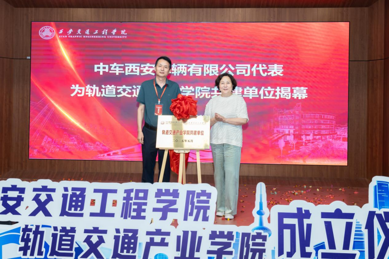 执行理事张慧、企业代表晋永荣为“轨道交通产业学院”揭牌