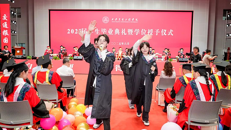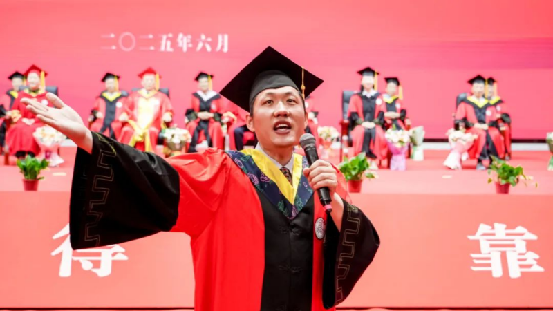 誓言铿锵,信念如磐。全体毕业生举起右拳庄严宣誓。典礼尾声,校歌《创造新时代的辉煌》旋律如常,全体毕业生用歌声表达着对母校浓浓的眷恋之声。