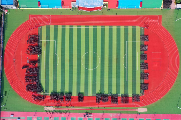 脚踏晨风,面向朝阳,上午8时40分,典礼正式拉开帷幕,全场师生、教官庄严肃穆,面向国旗,奏唱国歌。