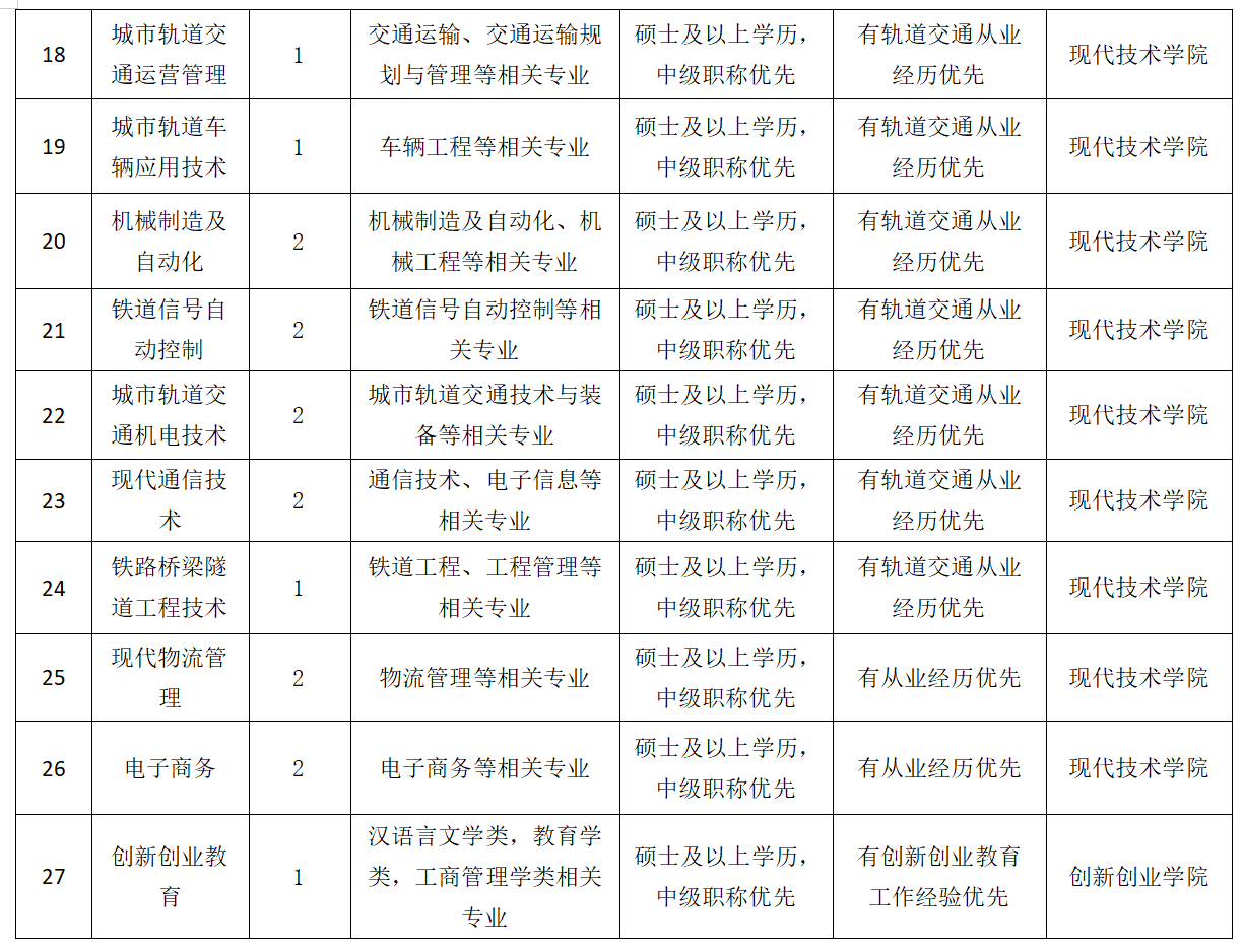 学校现有交通运输学院、机械与电气工程学院、中兴通信学院、土木与铁道工程学院、人文与管理学院、马克思主义学院、公共课部、创新创业学院、现代技术学院、继续教育学院10个教学单位。学校重视和加强大学文化建设,实施“文化铸校”战略,着力建设以精神文化、制度文化、行为文化和形象文化为基本内容的大学文化,不断提升大学文化品位,强化育人功能,彰显生机活力,为人才培养提供了良好的氛围和环境。
