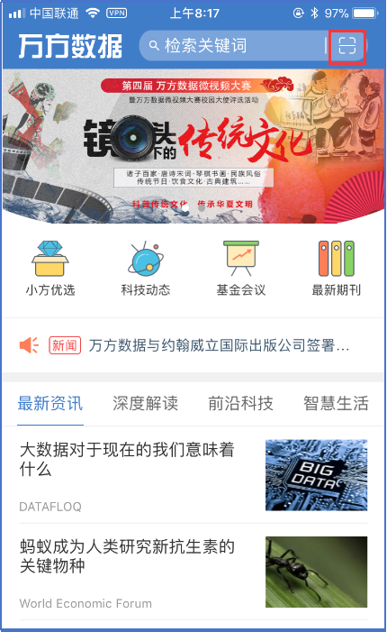 万方数据APP提供个人绑定机构功能,打开APP扫描二维码,即可将个人账号和机构账号绑定,绑定成功后该个人账户可在APP中享有机构权限,如免费下载机构已购资源、免费使用机构已开通服务等。个人账号绑定后,在机构设定的绑定期限内有效,超过期限后自动解绑,用户可扫码再次绑定。操作说明: