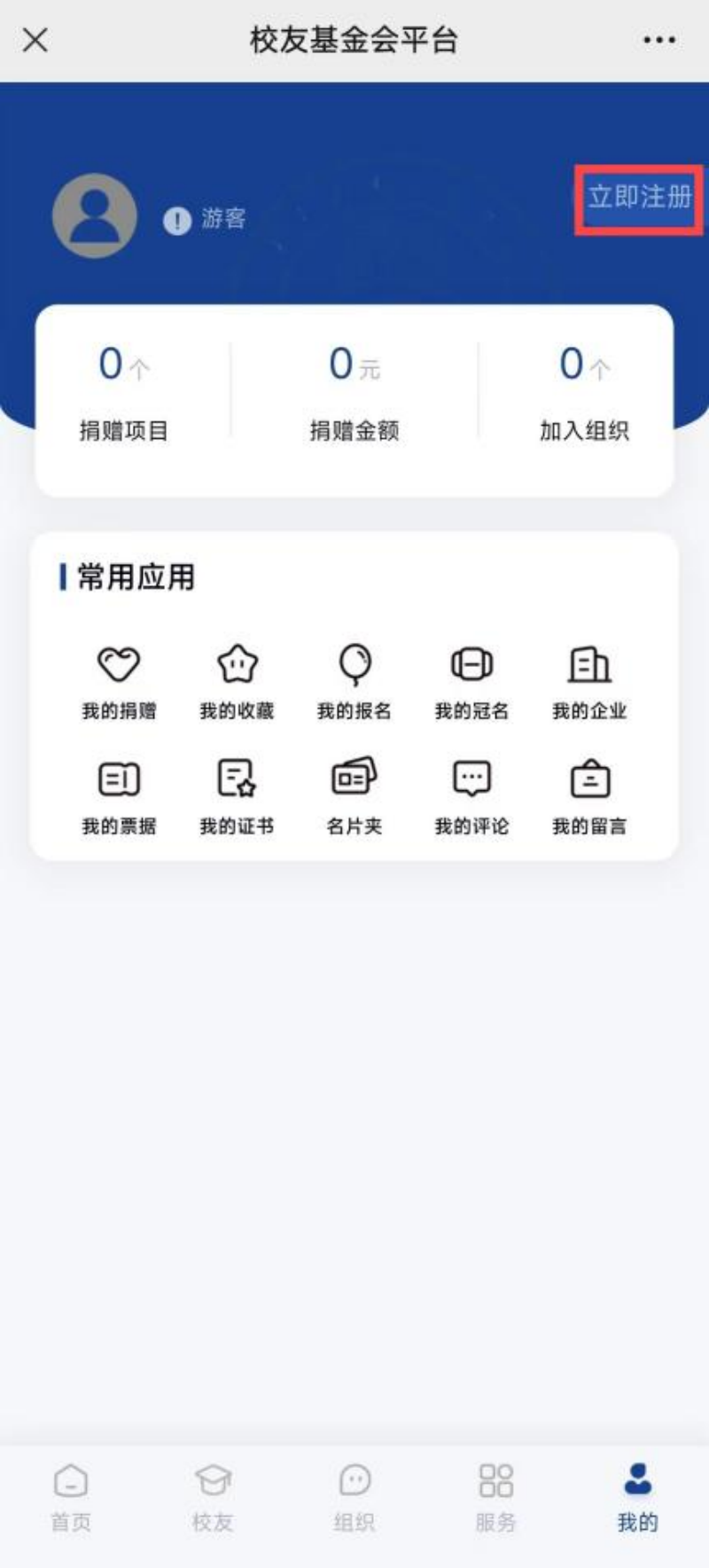 (二)首页右下角点击“我的”,进入个人信息页,点击“立即注册”。