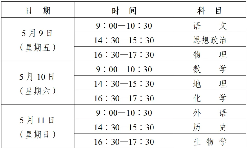 1.笔试科目。语文、数学、外语、思想政治、历史、地理、物理、化学、生物学等9科采用笔试方式。考试时间安排如下: