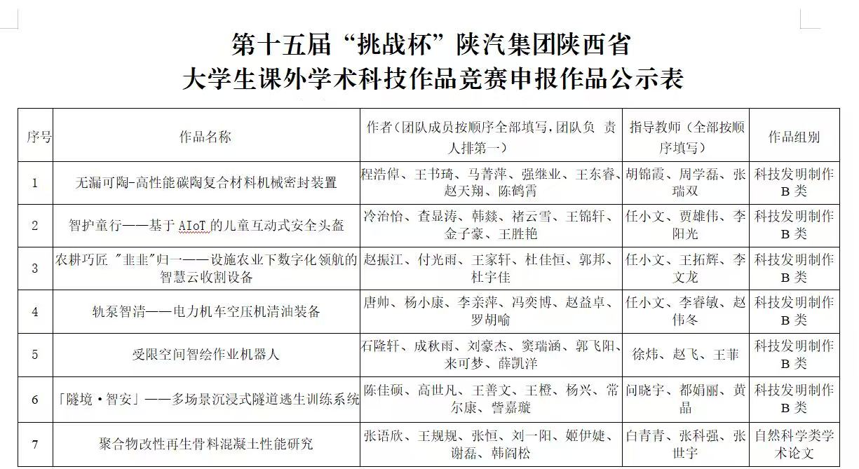 WilliamHill中文官方网站2025年“挑战杯”大学生课外学术科技作品竞赛经作品文本评审、答辩评审、评审组会商,已结束赛事所有环节。根据《共青团陕西省委 中共陕西省委教育工委 陕西省科学技术协会等关于组织开展第十五届“挑战杯”陕汽集团陕西省大学生课外学术科技作品竞赛的通知》(陕团联发〔2025〕10号)文件要求,WilliamHill从校赛获奖作品中,综合考虑项目成熟度、项目所属类别、学生团队学历层次等因素,拟推荐以下11件作品参加第十五届“挑战杯”陕汽集团陕西省大学生课外学术科技作品竞赛,名单详见附件。