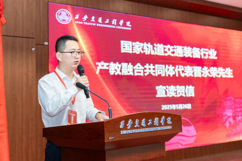 国家轨道交通装备行业产教融合共同体代表晋永荣现场宣读贺信,祝贺学院正式成立,并期待其发挥平台聚合效应,深化高端制造与人才培养体系融合发展,构建轨道交通产业人才新生态。