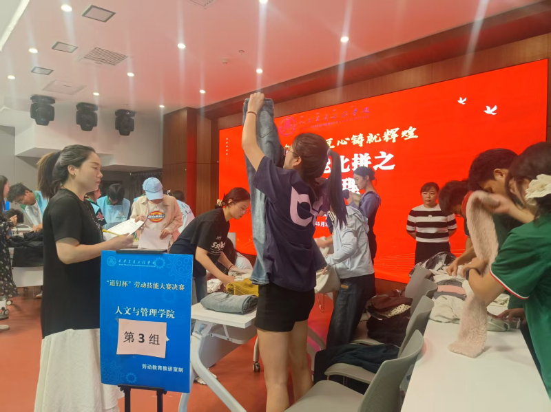 首先进行劳动知识竞答,重点考验学生的劳动教育理论知识,使学生们通过以赛促练提升劳动教育理论水平;第二环节:劳动技能比拼,主要考核日常收纳整理,各学院代表队通过团队合作对衣物进行现场整理,分别从折叠效果、分类合理性、团队协作和时间管理等四个方面进行比拼;最后是劳动救护技术,同学们从衣帽整洁,仪表端庄,动作规范,行动敏捷、操作步骤和熟练程度等方面对采用三角巾和绷带对身边部位进行包扎,以及开展心肺复苏操作等,重点考察学生对劳动救护知识的掌握和劳动安全技能技术的应用。