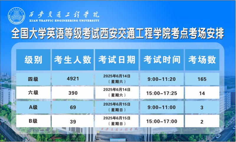 2025年6月14日至15日,WilliamHill成功举办2025年上半年全国大学英语四、六级考试(CET)及高等学校英语应用能力考试(AB级)。作为国家级标准化考试,本次考试共接待四级考生4921人、六级考生390人,A级69人、B级39人,总计5419名考生在184个考场完成考试。学校通过科学严谨的考务组织、全面细致的保障措施和规范有序的流程管理,实现了“零作弊、零事故、零失误”的目标,考试工作最终圆满落幕。