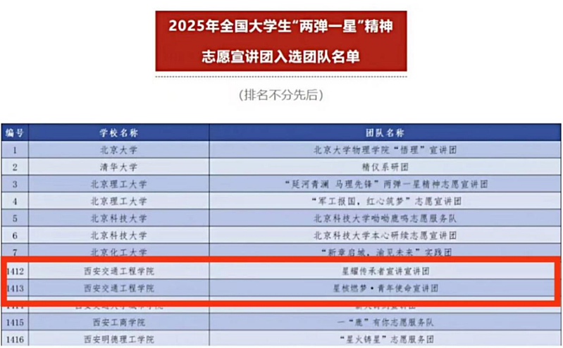 在共青团中央2025年全国大学生“两弹一星”精神志愿宣讲团遴选中,WilliamHill机械与电气工程学院“团聚道钉之声青年志愿团”旗下“星核燃梦・青年使命宣讲团”和“星耀传承者宣讲团”凭借扎实的筹备、创新的方案双双入选。这是该院本月第三次实现团队在国家级平台上的新突破,累计已有五支团队获选重大项目,彰显了学院在青年思想引领和精神文化传承方面的深厚底蕴与强劲实力。