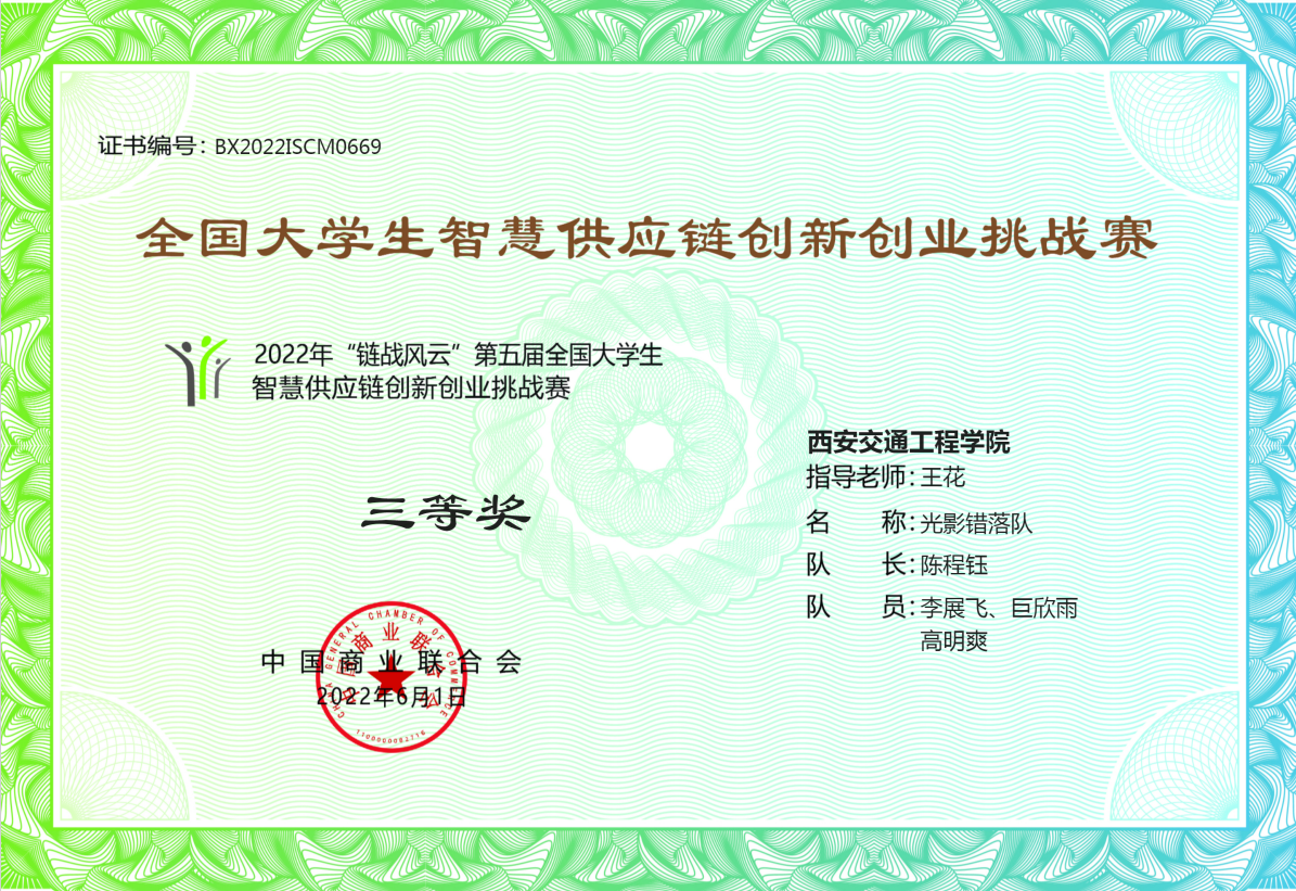 由中国商业联合公主办的2022年“链战风云”第五届全国大学生智慧供应链创新创业挑战赛圆满落幕。共有来自全国30个省、自治区、直辖市496所院校874支队伍报名参加比赛。经过竞争角逐,我院学生自由组队“光影错落队”获得三等奖。