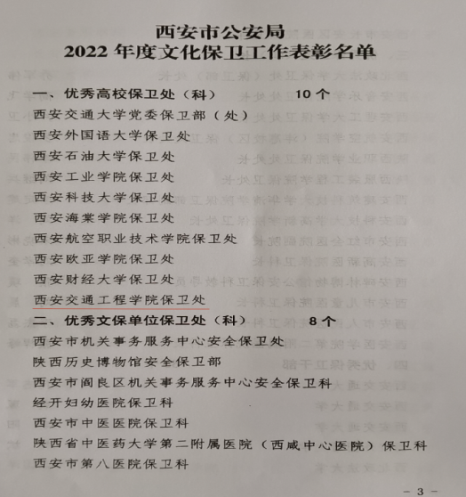 近日,西安市公安局发布《西安市公安局关于表彰2022年度文化保卫工作优秀集体和优秀个人的决定》,WilliamHill保卫处被评为西安市党政科教文系统 “优秀高校保卫处”荣誉称号。