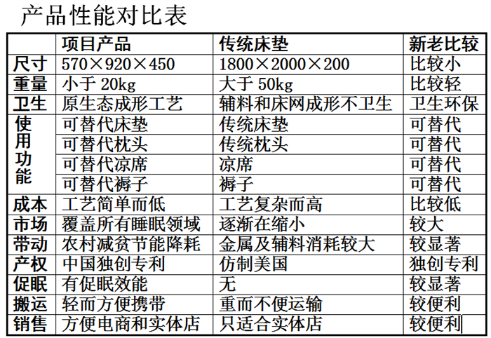 该产品的发明使得利用荞麦皮作为睡垫芯并替代自1870年美国人发明弹簧床垫以来成为可能。该项目的轻量化技术广泛推广应用后,因节约钢材而实现节能减排效果显著,因大量利用荞麦皮而提高农民收入进而推动农村脱贫解困预期显著。