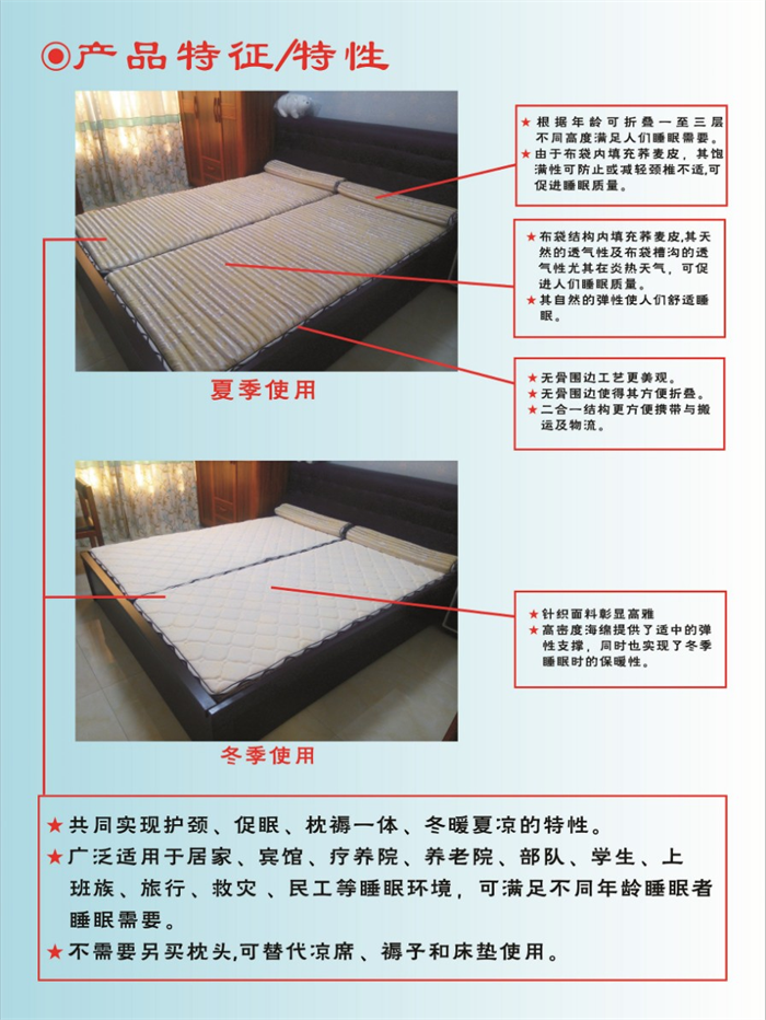 荞麦皮功能床垫(便携式睡垫)由睡垫和枕头构成,其中睡垫包括可折叠式睡垫芯和复合面料;枕头为可折叠式枕头。睡垫由横向若干行排列的布袋列内填充了荞麦皮,或其它类似填充物而形成的可折叠式睡垫芯与复合面料相连构成的。枕头为可折叠式枕头由横向若干行排列的布袋列内,填充了荞麦皮或其它类似填充物而形成,并与睡垫相连接,形成带有可折叠式睡垫与可折叠式枕头组合的荞麦皮功能床垫(便携式睡垫)。