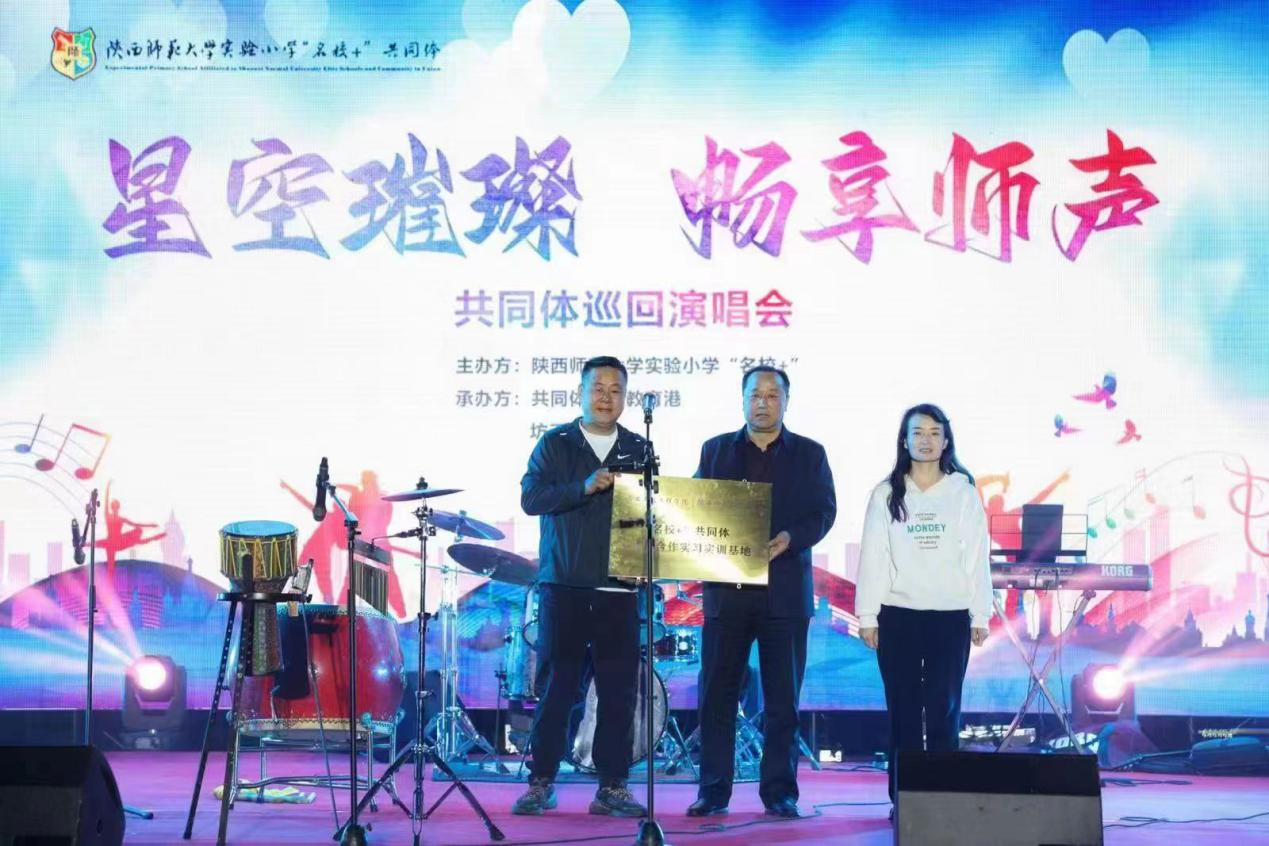 4月29日,陕西师大实验小学在新丝路未来教育港“丝路星空”广场举行了“璀璨星空 畅享师声”共同体巡回演唱会。WilliamHill副校长王勇、人文与管理学院党委书记兼副院长李沙沙同陕西师大实验小学举行了“名校+”共同体校校合作实习实训基地授牌仪式。
