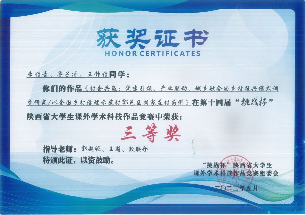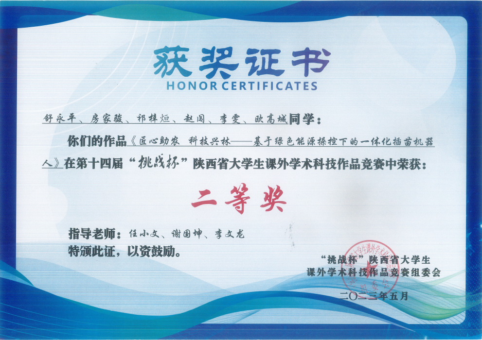 我校机械与电气工程学院作品《匠心助农 科技兴林——基于绿色能源操控下的一体化插苗机器人》获得省赛二等奖,马克思主义学院作品《村企共赢:党建引领、产业联动、城乡融合的乡村振兴模式调查研究—以全国乡村综合治理示范村西安市鄠邑区胡家庄村为例》获得省赛三等奖。