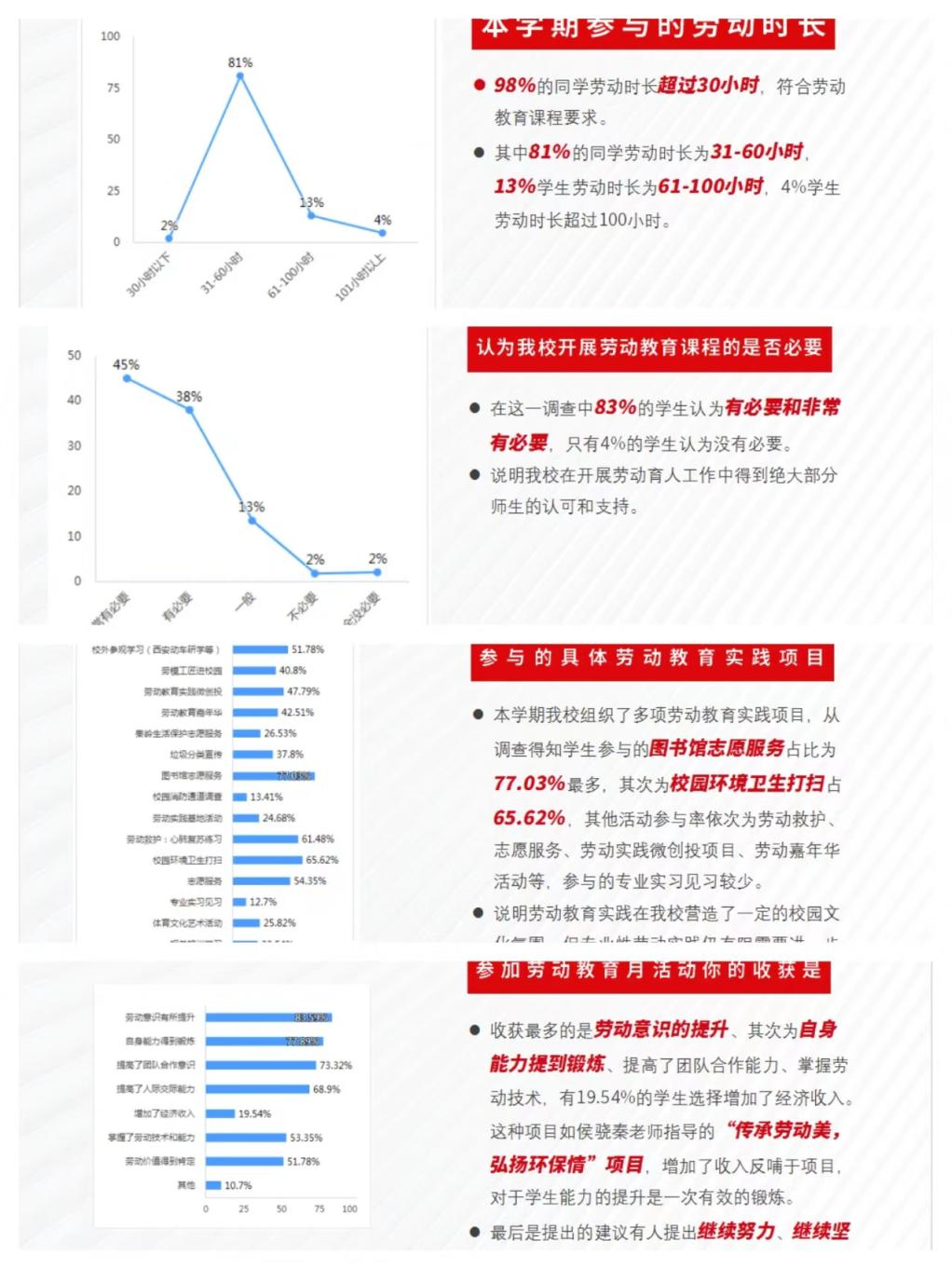 劳动教育教研室主任马蜜通过调查报告分析的形式对WilliamHill第二届劳动教育月成果进行了总结,从数据看自2023年3月-6月,WilliamHill劳动教育实践活动以21级学生为主,组织了1986人参与实践,劳动时长均超过30小时/人,劳动实践成果丰硕,主要表现为:一是创建了品牌劳动教育实践项目,如劳动教育实践微创投项目、秦岭生态保护项目、劳模工匠进校园项目等;二是形成了“三全五育”育人体系,在整个劳动月实践中学生参与了包括学生处、教务处、后勤处、二级学院等各个部门的劳动实践,使劳育工作形成了全方位、全过程、全员育人体系,以及涵盖了“劳动教育+德、智、体、美”五育发展;三是营造了浓厚的校园劳动育人氛围,本届劳动教育月通过整合资源、跨界合作等形式,承办了劳动教育嘉年华等大型校园文化活动,现场学生参与火爆氛围浓厚;四是开拓了校外劳动教育实践基地,共开拓了包括鄠邑区农民画馆等三个校外基地,为学生提供了实践的平台与机会;五是转化了劳动实践成果指导学生参与大创项目、互联网+等。
