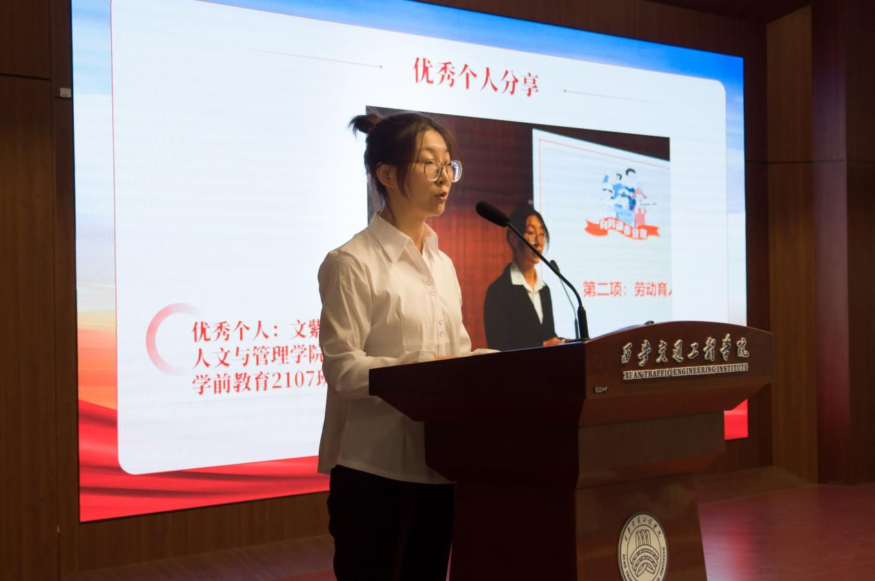优秀项目组“以道钉精神 筑交院青年”负责人土木工程学张培、优秀个人代表人文学院文紫阳同学分别分享了他们在劳动中的经验与收获,表示通过劳动感受了团队合作精神、磨砺了克服困难的勇气、收获了劳动能力的成长。
