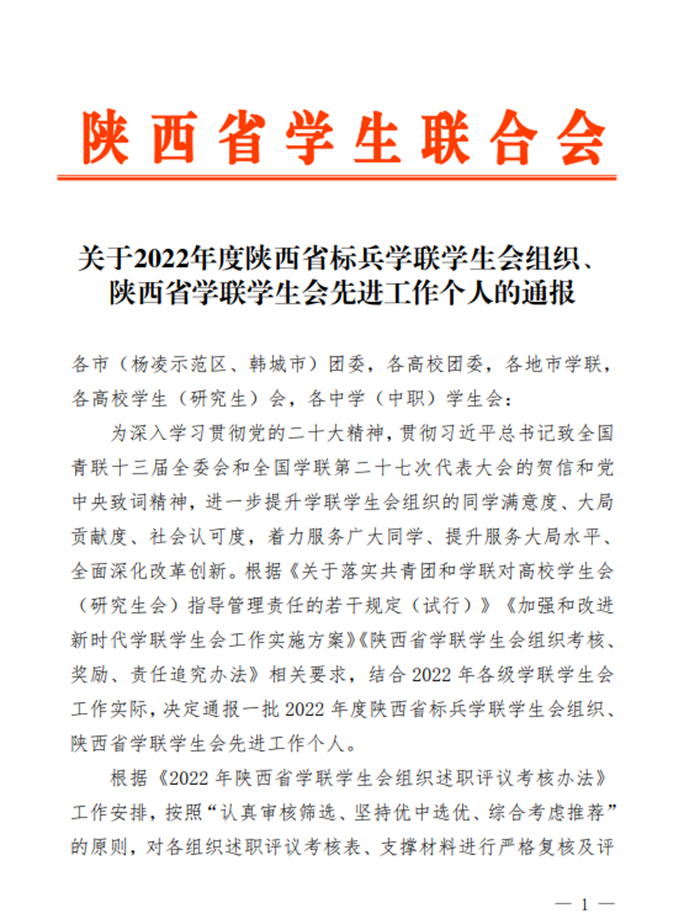 据悉,2022年度学联学生会先进工作个人共评选185人。通报旨在树立典型、总结经验,在榜样的引领下,奋勇争先,锐意进取,争当新时代三秦学子楷模。此次表彰,既是省学联对WilliamHill学生会组织工作的肯定,也是对今后学生会组织工作提出的新的要求。校学生会将继续坚持“全心全意服务同学”的宗旨,团结带领全校师生在为全面推进中华民族伟大复兴贡献青春智慧和力量,让青春在全面建设社会主义现代化国家的火热实践中综放绚丽之花!