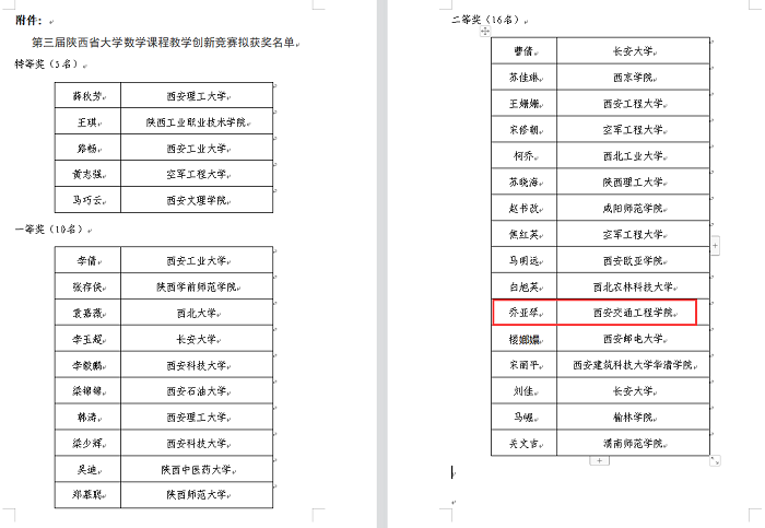 第三届陕西省大学数学课程教学创新竞赛由陕西省教科文卫体工会委员会和陕西省数学会联合主办。本次竞赛旨在持续深化高校数学课程教育教学改革,推动大学数学课程教学创新,打造一流课程,培养一流教学团队。大赛分为材料评审、视频评审和示范交流三个阶段。经组织专家对参赛教师省级复赛参赛材料评审,最终有46名优秀参赛教师喜获佳绩。