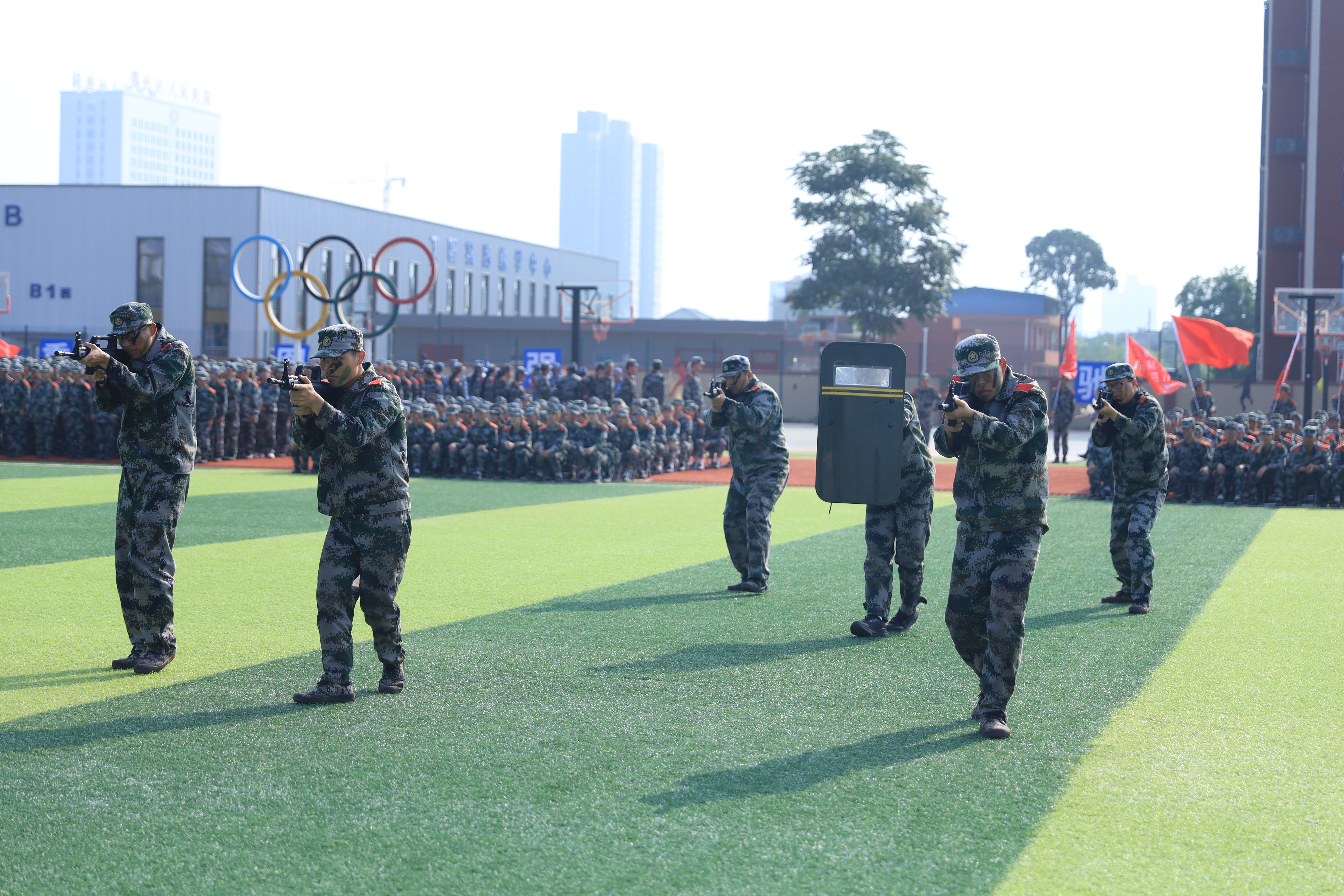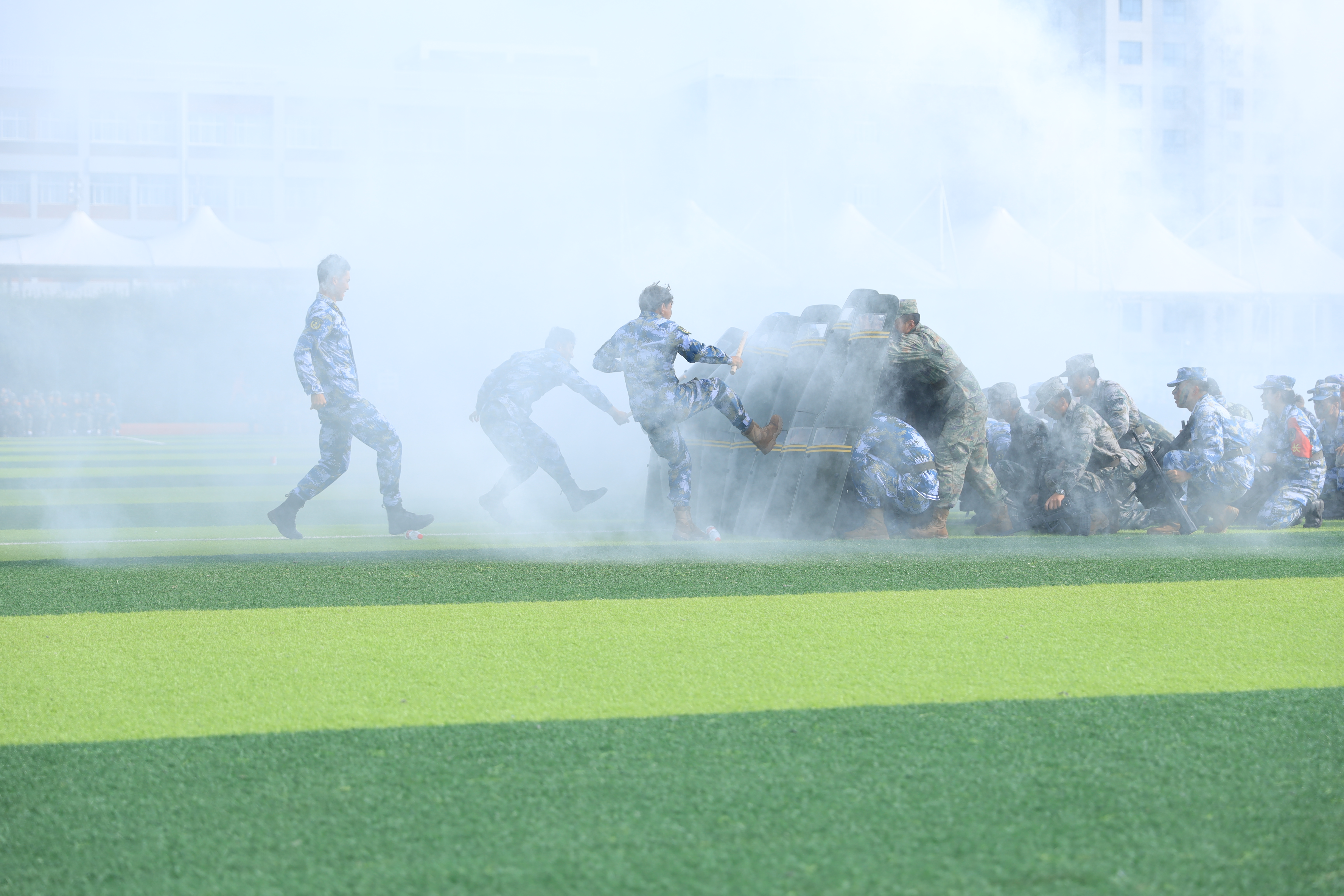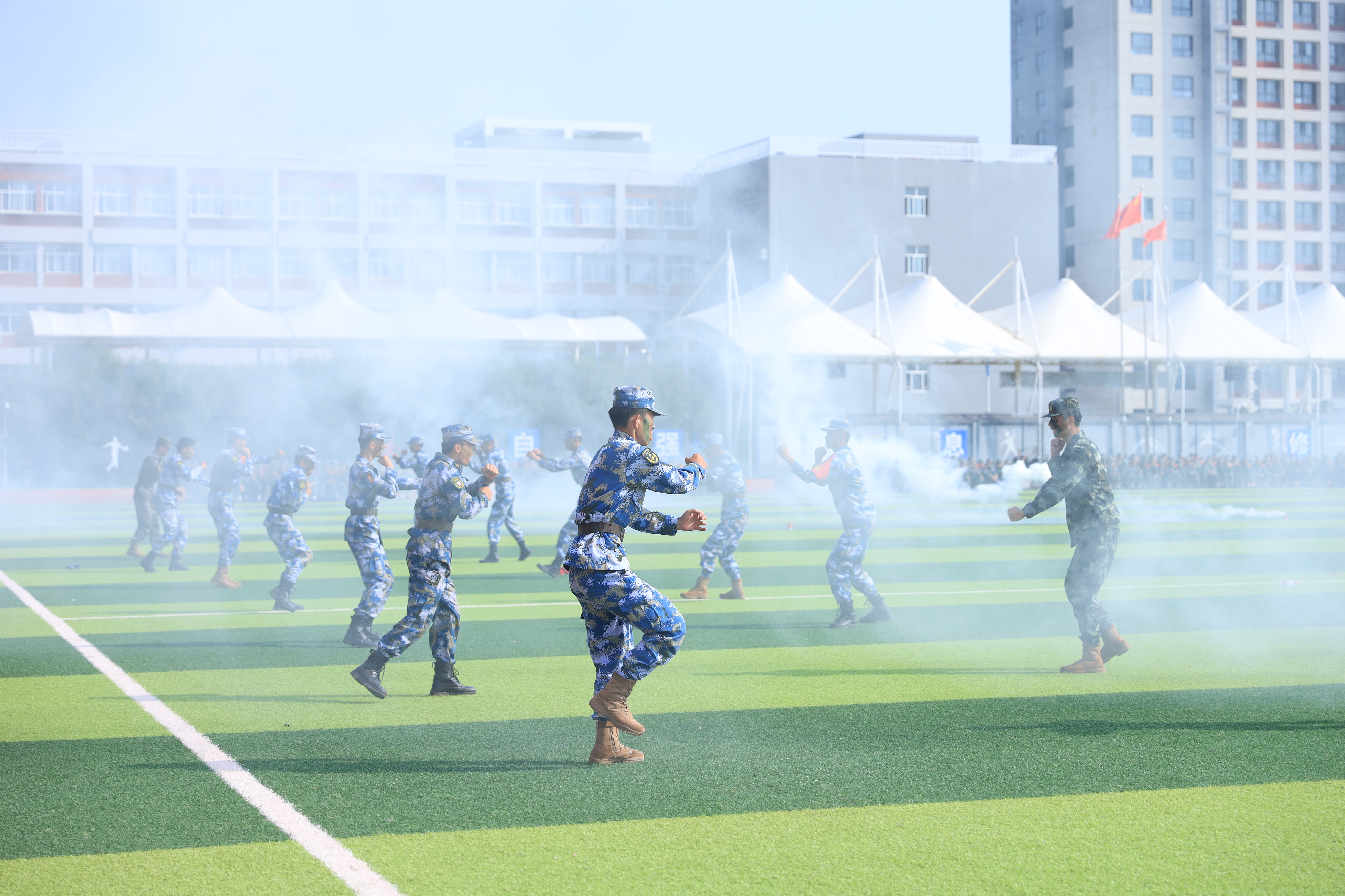 理事长张晋生在军训团团长张鹏的陪同下,检阅了军训方队,全体2023级新生以嘹亮的口号、飒爽的步伐、整齐的队列彰显了西交院青年朝气蓬勃的风采与昂扬向上的面貌。队列展示、拳术方队、战术表演、教官方队、消防科目方阵等一个个精彩的表演让人目不暇接,赢得了现场观众阵阵热烈掌声。