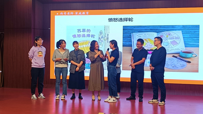 讲座上,杨琴荔老师从孩子们出现的情绪导入,列举了日常的一些负面情绪以及处理情绪的传统方式,引起了在座师生的共鸣。利用回答问题、构建模型、情景模拟、角色扮演等多样化的形式,与大家进行探讨和剖析孩子出现负面情绪的背后原因,并给出了相应的策略应对。杨老师亲切自然、生动形象的讲座让在场师生深刻意识到培养健康情绪的重要性和作用,学会培养孩子健康情绪的方法和做法。