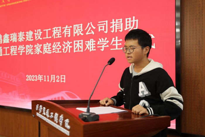 受助学生黎彦军代表发言,他感谢陕西鸿鑫瑞泰建设工程有限公司给予的关爱,感谢党和国家对家庭困难学生的帮助,并许诺会刻苦学习,练就技能本领,用实际行动回报国家,做一个对社会有用、对人民有用的人。