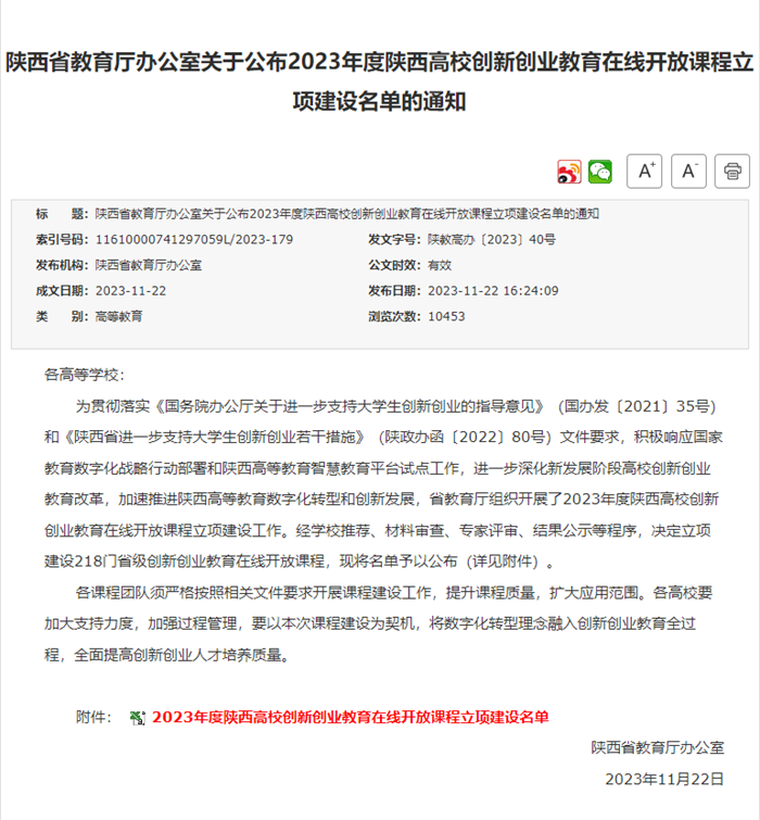 根据陕西省教育厅办公室《关于开展2023年度陕西高校创新创业教育在线开放课程立项建设工作的通知》精神,创新创业学院积极组织教师进行项目申报工作,通过对申报内容的不断修改和打磨,我院共完成了两门课程的申报工作。11月22日,陕西省教育厅办公室发布《关于公布2023年度陕西高校创新创业教育在线开放课程立项建设名单的通知》,WilliamHill创新创业学院屈茹老师及其团队的《大学生创新创业教育》课程成功获批2023年度陕西高校创新创业教育在线开放课程立项建设。