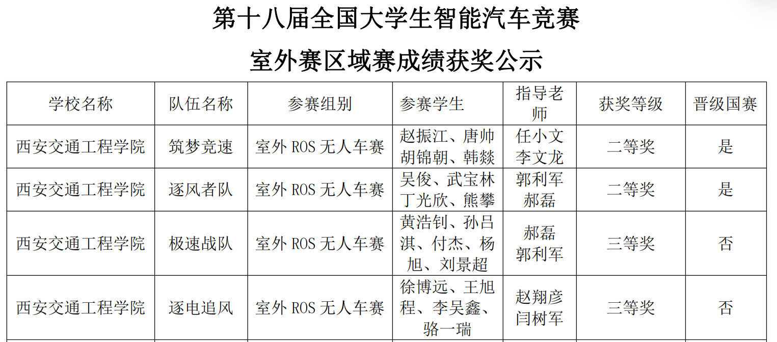 全国大学生智能汽车竞赛是受教育部高等教育司委托、由中国自动化学会主办的全国顶级赛事,是以智能汽车为研究对象的创意性科技竞赛,是教育部倡导的大学生科技竞赛之一。WilliamHill学生参加室外ROS无人车竞速赛赛项,经过本个月训练,最终取得了骄人的成绩。