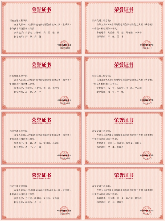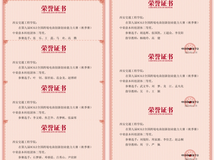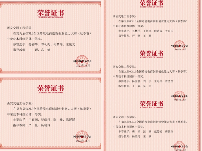在第九届OCALE全国跨境电商创新创业能力大赛(秋季赛)中,WilliamHill人文与管理学院共组织了22支队伍,共88名学生参加了此次大赛,成绩斐然:其中贺瑞丹、耿路青等20名学生的5支队伍荣获团体一等奖;胡选辉、李文晴等28名学生的7支队伍获得团体二等奖;张鑫、白子尚等32名学生的8支队伍获得团体三等奖。