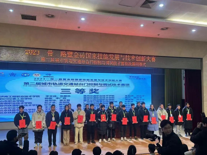 为了进一步促进轨道交通类专业建设与教学改革,不断提升轨道交通行业人才培养质量,助力国家“新基建”发展和交通强国战略。由交通运输学院院长崔炳谋和副院长王亚欧带领参赛同学赴河北轨道职业技术学院参加了2023一带一路暨金砖国家技能发展与技术创新大赛之城市轨道交通站台门控制与调试技术决赛。经过激烈角逐,交通运输学院学子凭借扎实的理论基础和出色的实践能力,在众多参赛队伍中脱颖而出,荣获三等奖。
