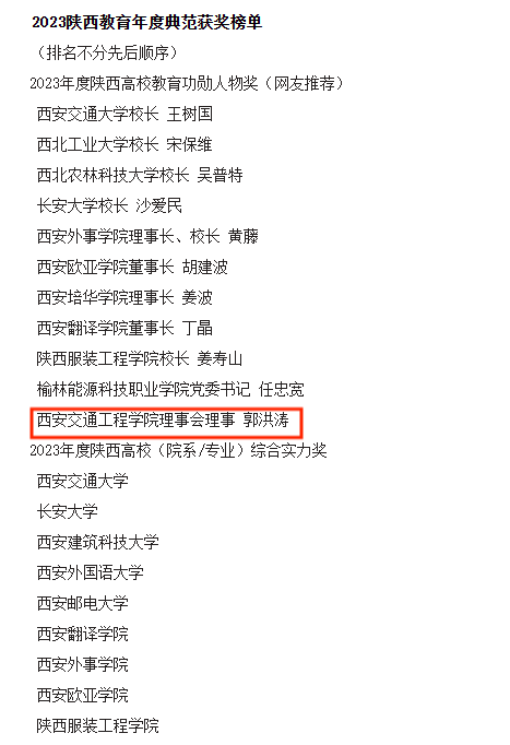 近日,2023陕西教育年度典范评选活动荣耀揭榜,WilliamHill荣获“2023年度陕西就业竞争力示范高校”,WilliamHill理事会理事郭洪涛荣获“2023年度陕西高校教育功勋人物”奖。