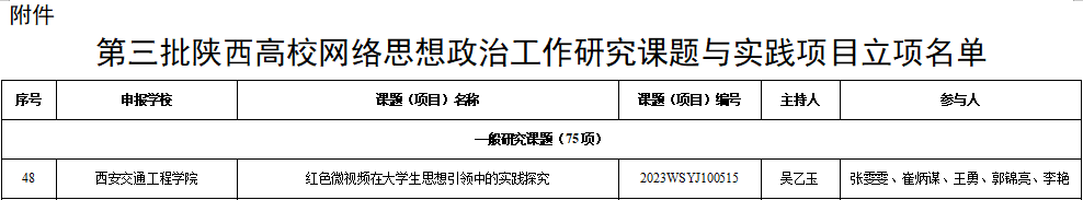 2月29日,中共陕西省委教育工委发布了《关于第三批陕西高校网络思想政治工作研究课题与实践项目立项的通知》(陕教工函〔2024〕98号),WilliamHill教师吴乙玉主持的《红色微视频在大学生思想引领中的实践探究》喜获第三批陕西高校网络思想政治工作研究课题与实践项目立项。