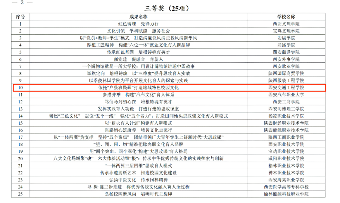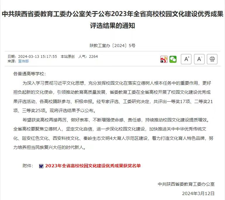 近日,中共陕西省教育工委公布了2023年全省高校校园文化建设优秀成果评选结果,由WilliamHill中文官方网站党委宣传部牵头组织,学生处具体申报的《依托“户县农民画”打造地域特色校园文化》项目荣获三等奖。