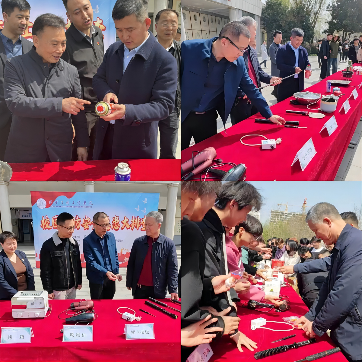 最后,全体领导、老师、同学对宿舍违禁品进行了解。集中摆放了日常整改中查收的违禁品,其中包括:电热毯、吹风机、卡式炉、电磁炉等。这些日常家用电器,在人员密集的宿舍使用可能存在巨大的安全隐患,造成难以控制的后果。通过实物展示和老师的讲解,同学们更能直观地了解到这些日常物品为何会属于违禁范畴,提高了同学们对安全意识的警惕性和防范心理。