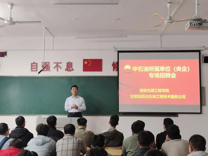 宣讲会上,甘肃迅而达石油工程技术服务公司招聘小组负责人通过视频、PPT展示等方式向毕业生们介绍了公司的基本情况、发展历史、未来前景等,并围绕公司资源与优势、人才培养体系、业务布局、企业岗位需求、薪酬福利等几个面进行重点宣讲。