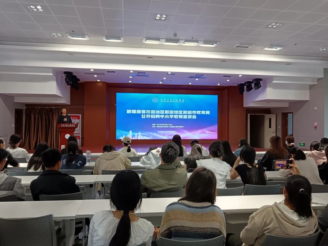 宣讲会上,和田市教育局何老师通过视频、PPT展示等方式介绍了基本情况,并围绕资源与优势、人才培养体系、业务布局、岗位需求等几个面进行了宣讲。毕业生对于和田地区在人才培养、引进、激励、支持、保障方面持续用力,强调差别和个性,人文关怀更暖、激励保障更优,并逐步优化完善人才支持政策等方面进行了了解。