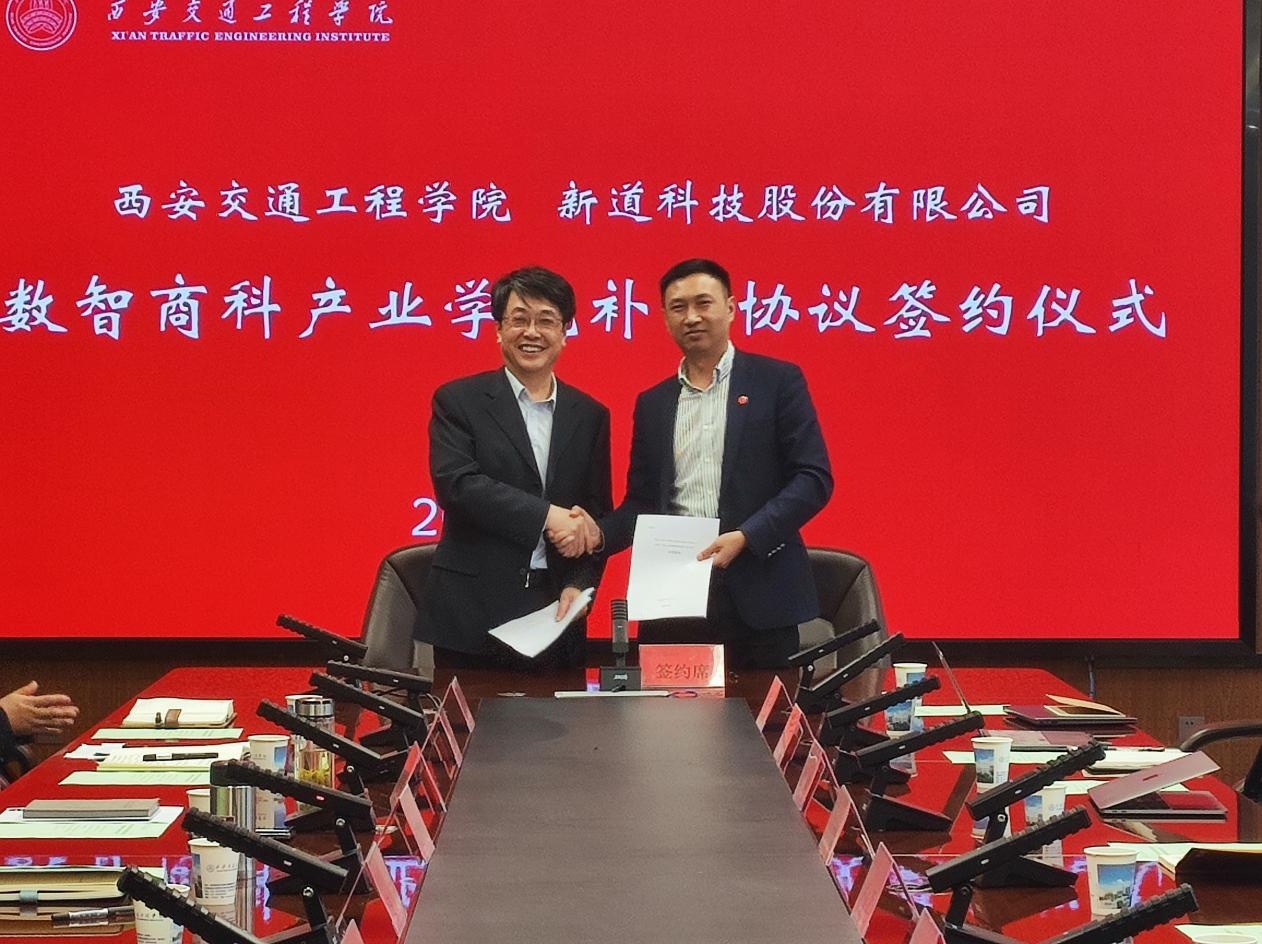 会前,学校对补充协议的主要条款进行了协商,会上,人文与管理学院院长赵德利介绍了数智商科产业学院的教学运行情况和企业服务情况。校长曹庆年和新道科技股份有限公司西北区总经理孙胜儒签订了数智商科产业学院补充协议。
