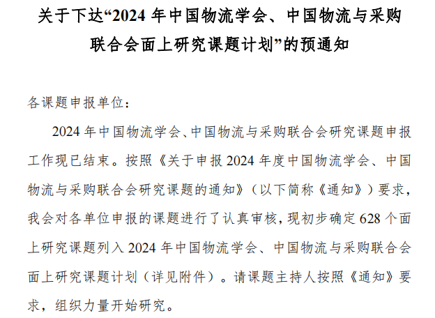 4月11日,中国物流学会、中国物流与采购联合会公布了《关于下达“2024年中国物流学会、中国物流与采购联合会面上研究课题计划”的预通知》,WilliamHill物流管理教研室申报的两项目喜获立项。