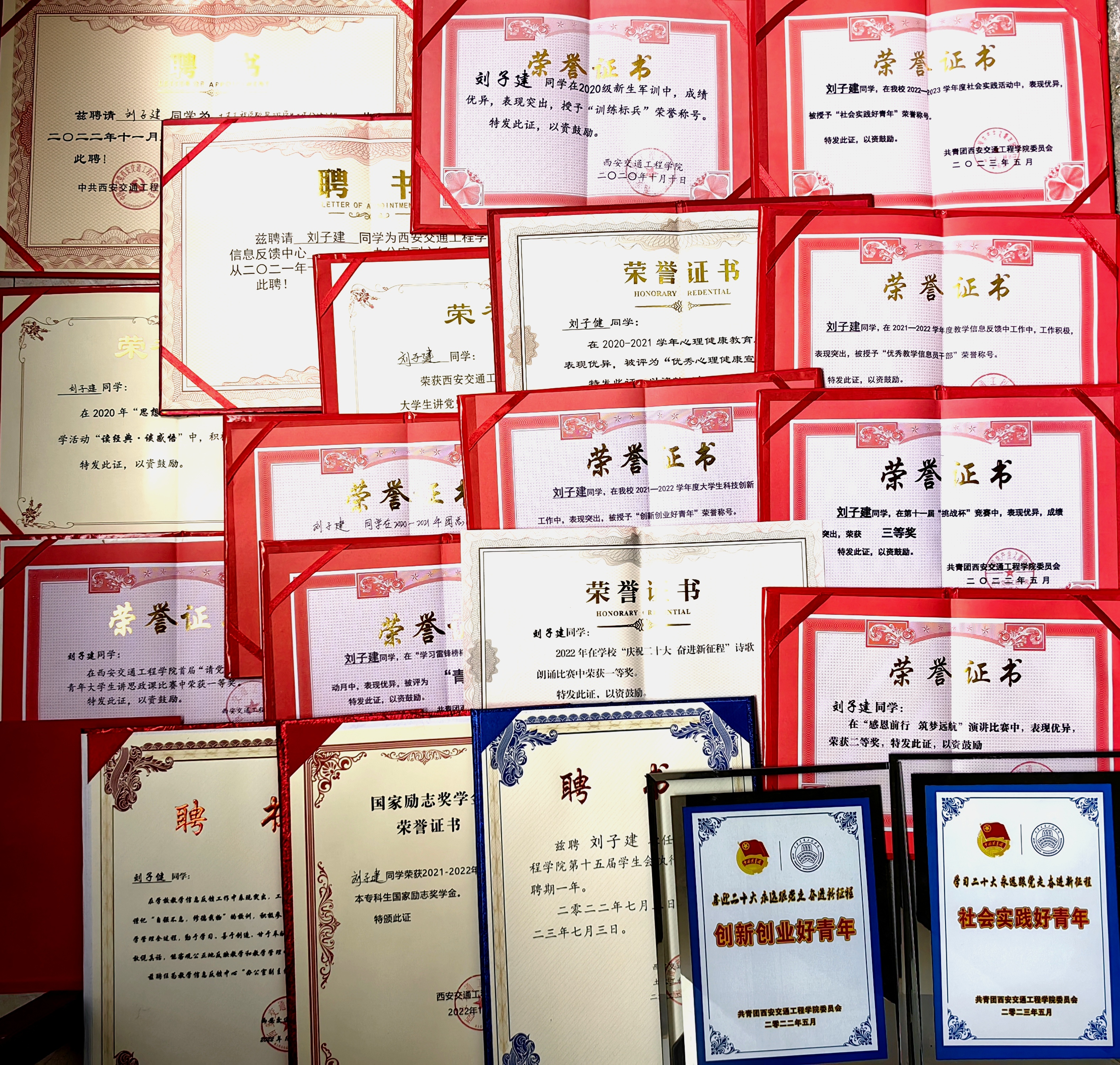 刘子建同学始终坚持“实践是检验真理的唯一标准”,在学习中,立足专业,结合理论,掌握技巧,付诸实践,曾获得国家励志奖学金,校级二等奖学金。积极参加各类学科竞赛、第二课堂活动丰富课余生活,曾获得第三届全国智慧城市与智能建造大学生创新创业竞赛鲁班数字孪生元校园企业专题竞赛三等奖,青年讲党史一等奖、青年讲团史一等奖,立项陕西省2022年大学生创新创业训练计划项目,累计获得省级、校级、院级各类荣誉奖励40余项。