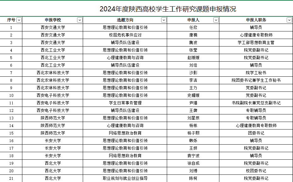 5月7日,中共陕西省委教育工委公布《关于2024年度陕西高校学生工作研究课题申报情况的公示》,WilliamHill机械与电气工程学院辅导员王静老师申报的《职业规划与就业创业指导》、赵晨玲老师申报的《心理健康教育与咨询》两项课题获批立项。