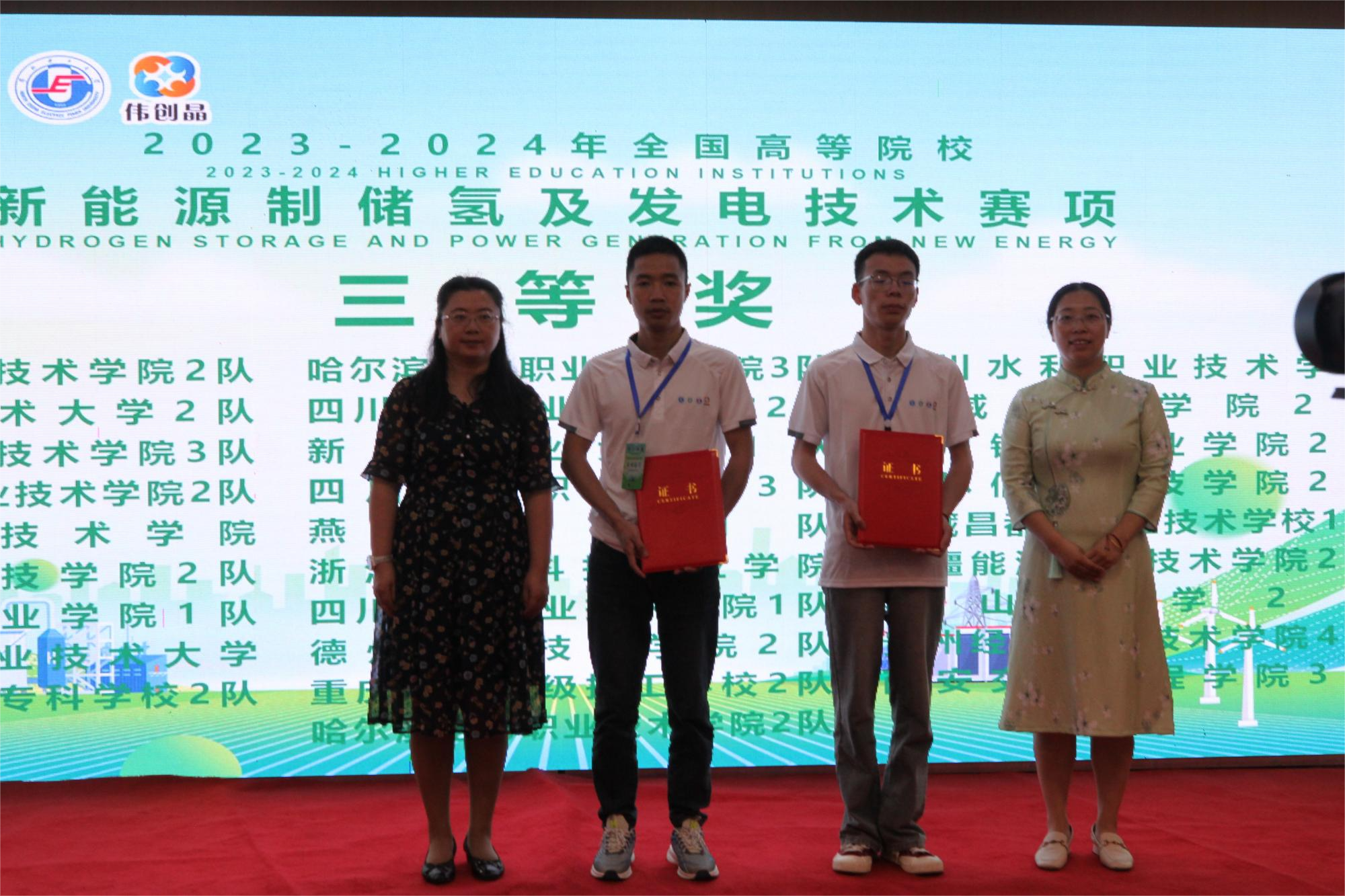 5月16日-19日,在重庆电力高等专科学校举行的全国首届高等学校新能源制储氢及发电技术竞赛中,机械与电气工程学院任小文老师和学生赵振江组成的参赛一队荣获国家二等奖,陆海燕老师和学生郭帮组成的参赛二队获得国家三等奖。