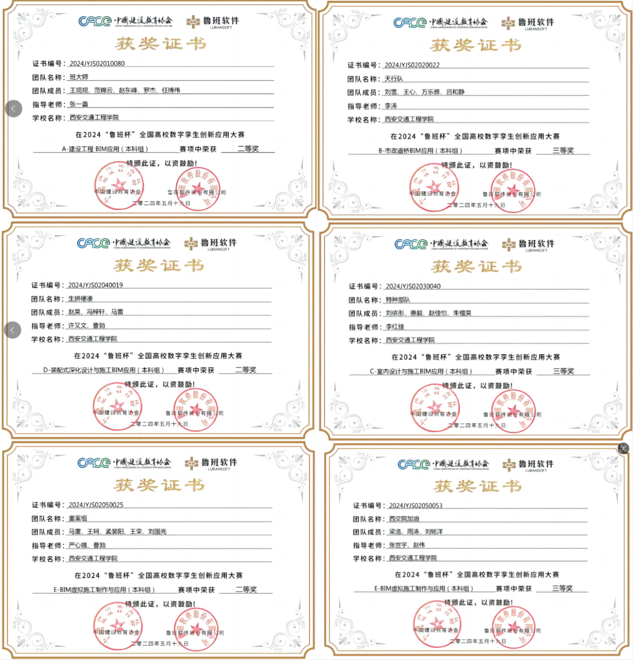 本次大赛共分为A-建设工程BIM应用、B-市政道桥BIM应用、C-室内设计与施工BIM应用、D-装配式深化设计与施工BIM应用、E-BIM虚拟施工制作与应用、F-数字孪生创新应用六大赛项。土木与铁道工程学院教师严心娥指导学生组成的“重案组队”、张一鑫指导学生组成的“班大师队”、许又文指导学生组成的“生拼硬凑队”、李涛指导学生组成的“天行队”、李红佳指导学生组成的“特种部队”、张世宇和赵伟指导学生组成的“西交院加油队”入围本科组总决赛,经过激烈角逐,分别荣获A-建设工程BIM应用赛项二等奖1项、D-装配式深化设计与施工BIM应用赛项二等奖1项、E-BIM虚拟施工制作与应用赛项二等奖和三等奖各1项、B-市政道桥BIM应用赛项三等奖1项、C-室内设计与施工BIM应用赛项三等奖1项。