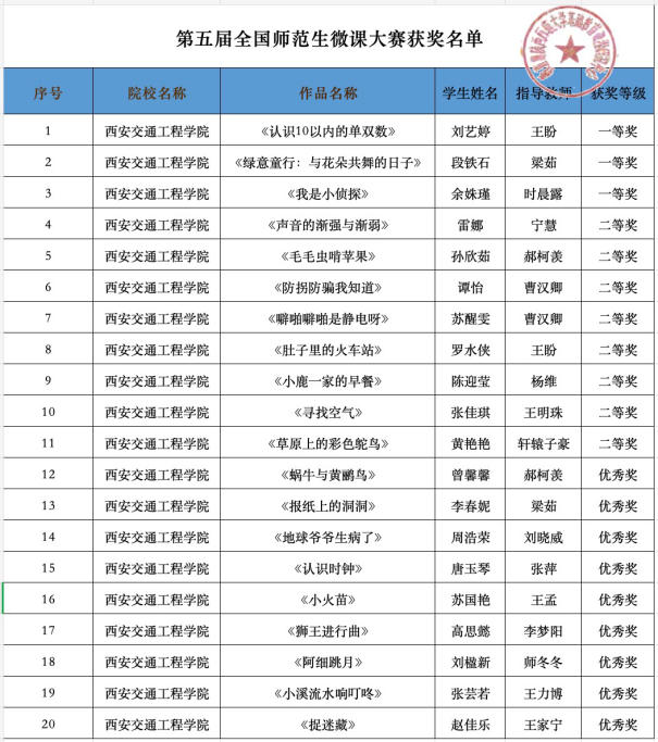 为了提高师范生的信息化教学能力和实践创新能力,加快创新型卓越教师的培养。近日,由教育部主办、教育部陕西师范大学基础教育课程研究中心和西北教师教育联盟联合承办的全国师范生微课大赛举行。WilliamHill学前教育和音乐教研室积极组织、悉心指导学生参加“第五届全国师范生微课大赛”,获得全国一等奖3个、二等奖8个、优秀奖9个的好成绩。
