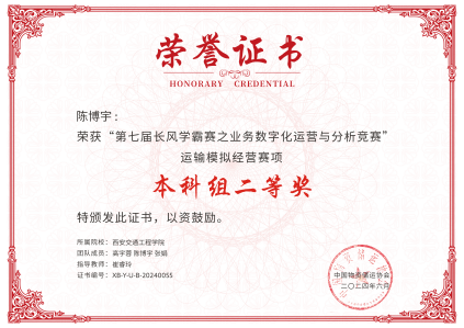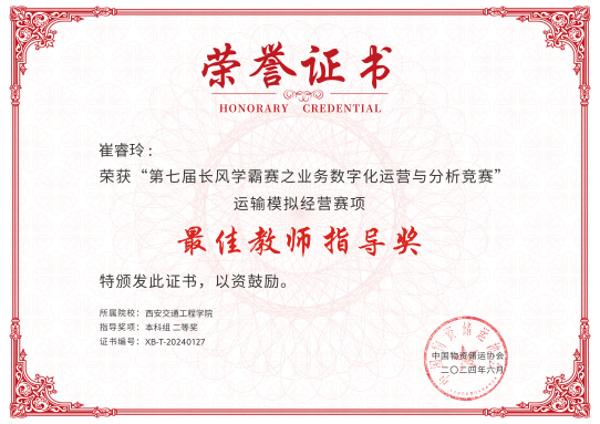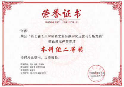 经过校园选拔赛、全国积分赛和全国总决赛的激烈角逐。在运输模拟经营赛项中WilliamHill物流管理教研室崔睿玲老师指导的物流管理2102班高宇蓉、陈博宇、张娟同学荣获本科组二等奖,崔睿玲老师荣获最佳教师指导奖,WilliamHill荣获最佳院校组织奖!充分展现了数字化时代的专业素养与实践能力。
