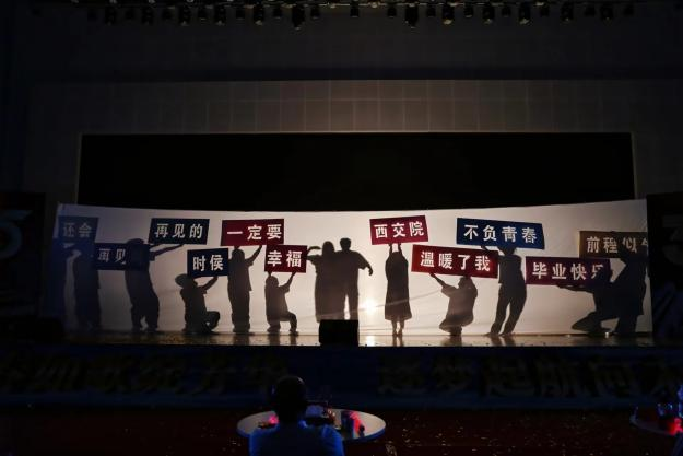 由毕业生代表崔杰、贾晶等4名同学带来的朗诵《感恩母校 感谢师恩》把晚会推向了一个新的高潮,他们深情的朗诵,述说着大学四年的美好生活,述说着对母校的感激不舍和祝福之情,他们的朗诵感染了现场师生,不仅湿润了大家的眼眶,也勾起了大家对大学生活的无尽回忆;毕业生代表刘子建、康家豪、粟娅为理事长张晋生教授送上了用记录了张理事长工作点点滴滴的369张照片拼成的一幅相框,体现张晋生教授对教育事业的鉴定信念、甘于奉献和无私的爱,并祝愿张理事长的生活像这幅拼图一样色彩斑斓,祝张理事长的教育事业如这幅拼图一样和谐统一,熠熠生辉。