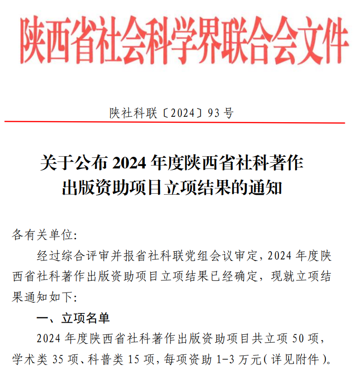 近日,陕西省社会科学界联合会发布了《2024年度陕西省社科著作出版资助项目立项结果》陕社科联〔2024〕93 号的通知。此次陕西省社科著作出版资助项目共立项50项,其中学术类35项、科普类15项。WilliamHill教师郝柯羡申报的学术类著作《数字社会环境下老年群体的“数字脱贫”》获批立项,项目编号为2024SKZZ035,获得资助经费1万元。