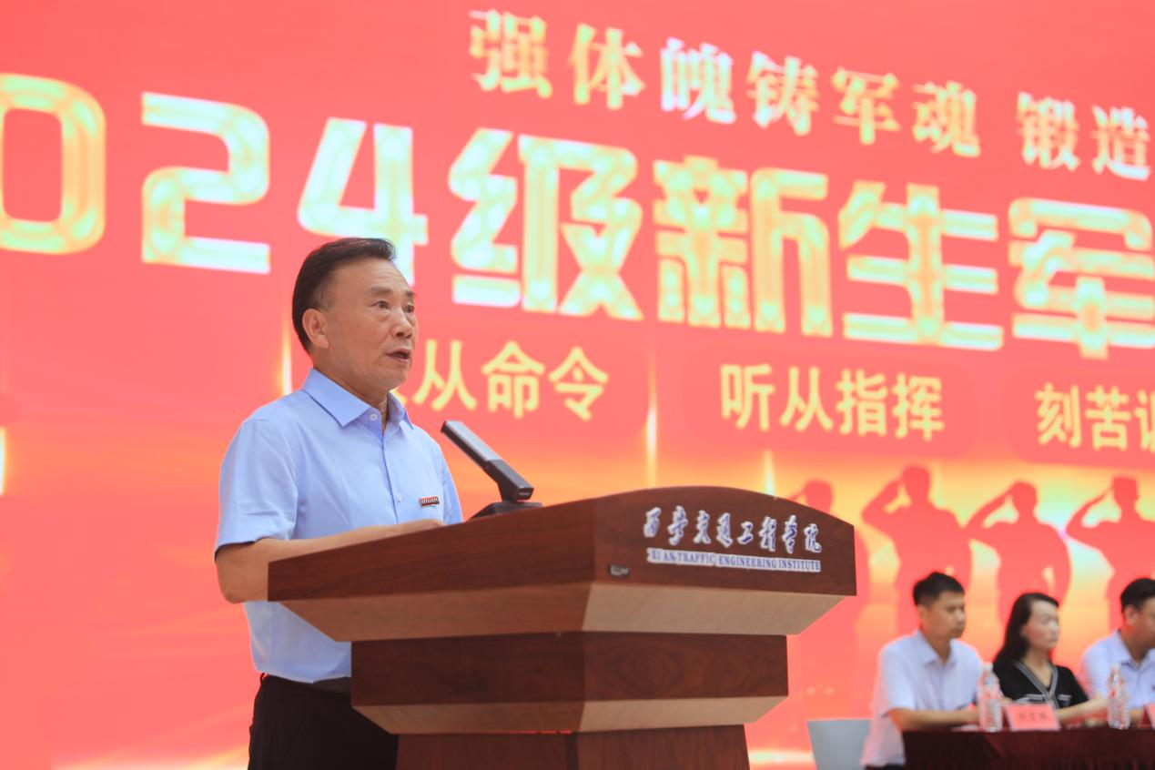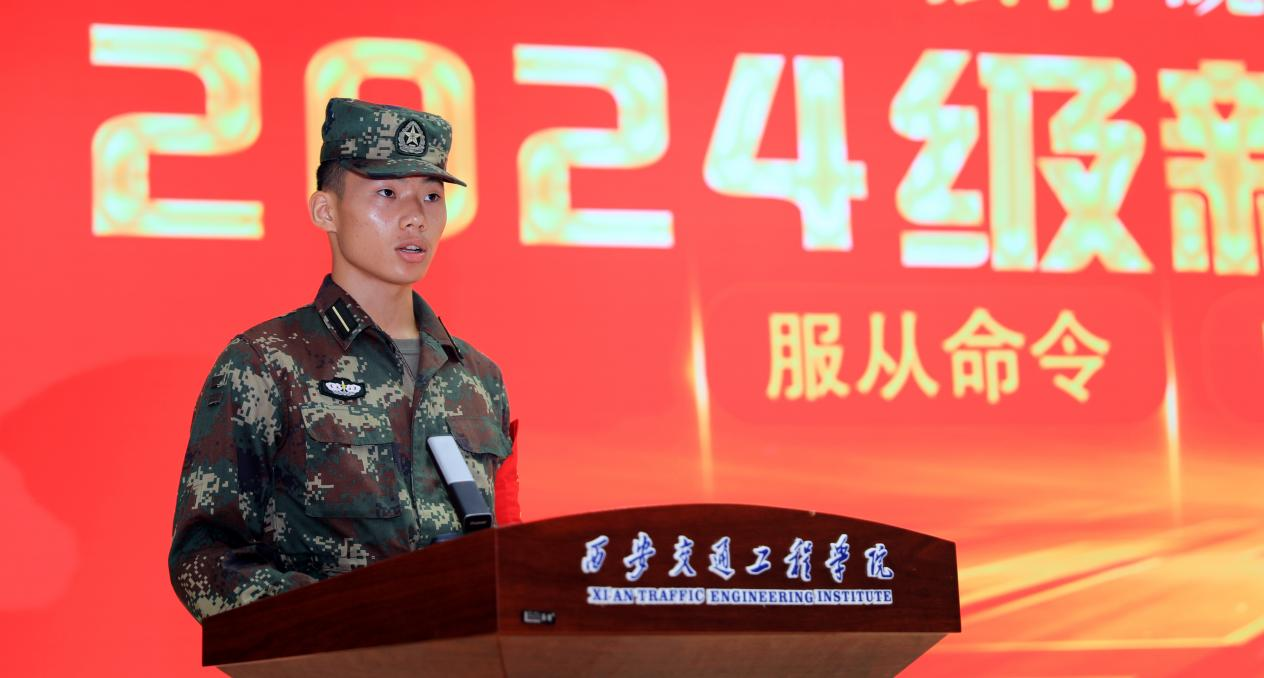 2024级新生牛阳阳代表军训学员发言,他郑重承诺,在军训期间恪守纪律,发扬团队精神,听从组织安排,锻炼体格、磨炼意志,保质保量完成各项军训任务,坚定理想信念,强化国防意识,筑牢忠诚之魂。