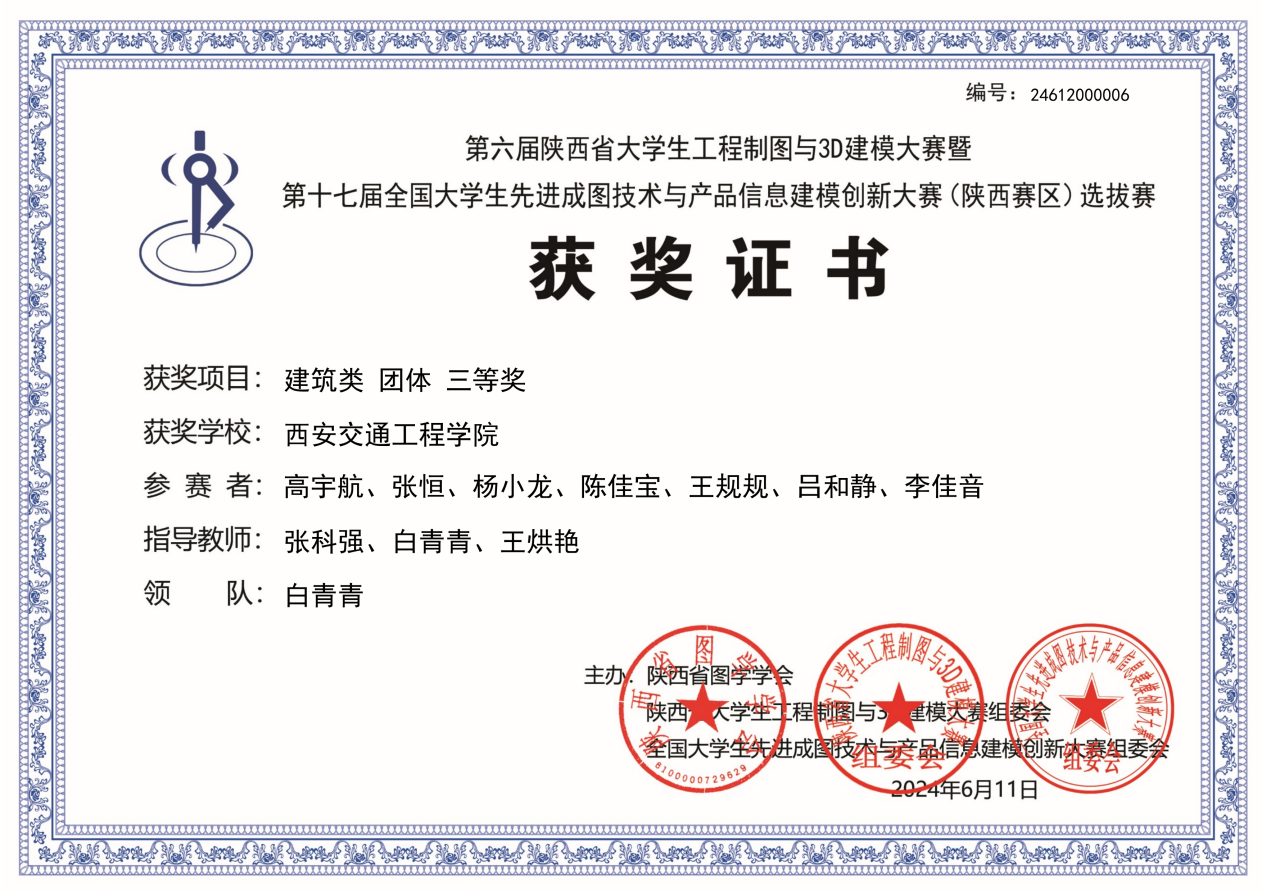 第六届陕西省大学生工程制图与3D建模大赛暨第十七届全国大学生先进成图技术与产品信息建模创新大赛(陕西赛区)选拔赛在西安文理学院举办,共有西安交通大学、西北工业大学、西安工程大学、长安大学、西安科技大学等省内35所高校的768位学生参加了比赛。WilliamHill土木与铁道工程学院组织高宇航、张恒、杨小龙等24名学生参赛,通过激烈角逐,最终获得建筑类团体三等奖1项,先进成图技术赛道一等奖1项、二等奖4项、三等奖8项,智能建筑结构设计赛道二等奖1项,BIM创新应用赛道三等奖1项,张科强、白青青、王烘艳被评为“优秀指导教师”。