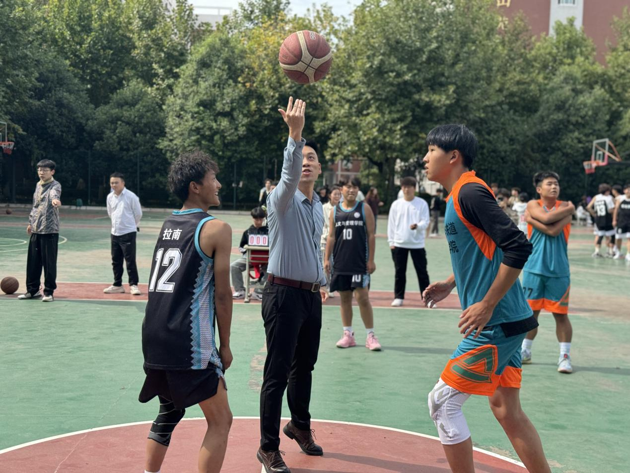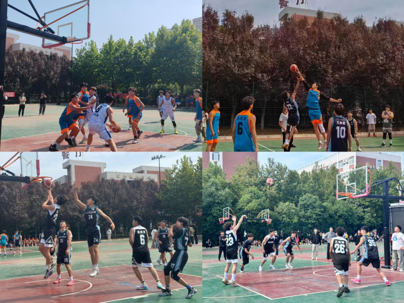 随着一声哨响,副校长张学堂、学生处处长钱穆萨、团委书记王小英分别为3场赛事开球,比赛正式开始。球员们相互配合,严密防守,奔走在赛场上,进球时击掌庆贺、输球时拍肩鼓励,精准的传球、上篮不断上演。团队的配合,技巧的应用,每一幕都是同学们的努力与付出,应和着啦啦队的欢呼声把比赛推向高潮。