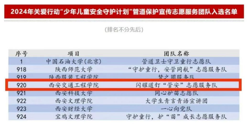 为深入学习贯彻习近平新时代中国特色社会主义思想,全面践行党的二十大精神,进一步提升社会公众对国家石油天然气管道保护的意识,筑牢油气管道安全的“人民防线”,团中央青年志愿者行动指导中心与中国青年志愿者协会秘书处发布了《关于遴选2024年关爱行动“少年儿童安全守护计划”管道保护宣传志愿服务团队的公告》。全国高校的青年志愿服务团队积极响应,经过激烈角逐,来自419所高校的1000支团队脱颖而出,WilliamHill机械与电气工程学院“闪耀道钉‘管安’志愿服务队”成功入选,成为全国1000支优秀团队之一。