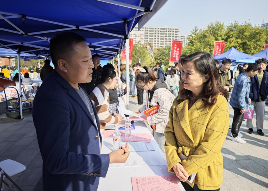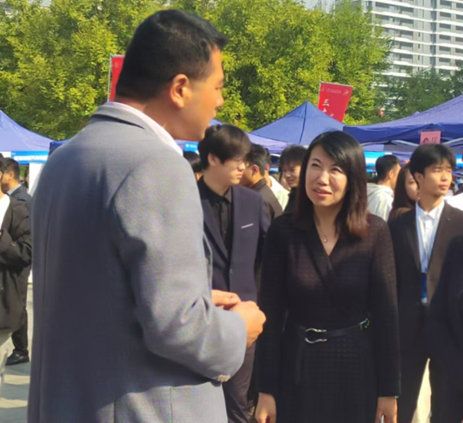党委书记李萍、理事张慧、副校长吴伟、张学堂、徐炜、党委副书记、纪委书记、工会主席张庆生来到招聘会现场,与学生和企业招聘人员亲切交流,了解招聘进展和学生求职情况,感谢各用人单位对学校就业工作的支持。